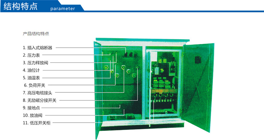 該產(chǎn)品將高壓負(fù)荷開關(guān)、高壓熔斷器置于變壓器油中,具有與變壓器器身共箱或分箱兩種結(jié)構(gòu)形式。油箱采用全密封結(jié)構(gòu),配有油溫表、油位表、壓力表、壓力釋放閥、放油閥等元件以監(jiān)測變壓器運行狀況。該產(chǎn)品分為環(huán)網(wǎng)型、終端型及電源型供電方式。為了使此種產(chǎn)品更適合于我電網(wǎng)的實際要求,公司又推了插拔型干式熔斷器,熔絲的熔斷不影響變壓器油的性能。根據(jù)低壓饋出要求的復(fù)雜程度,YBM-12/0.4型產(chǎn)品分為標(biāo)準(zhǔn)型、加強型和綜合型三種外殼形式,使用戶和設(shè)計單位在選型時,做到更靈活、更經(jīng)濟(jì)。